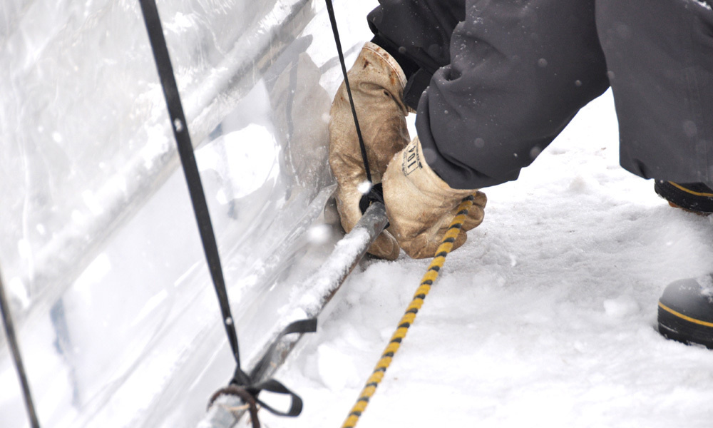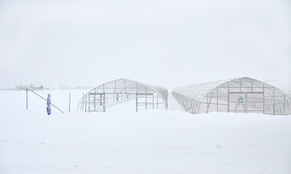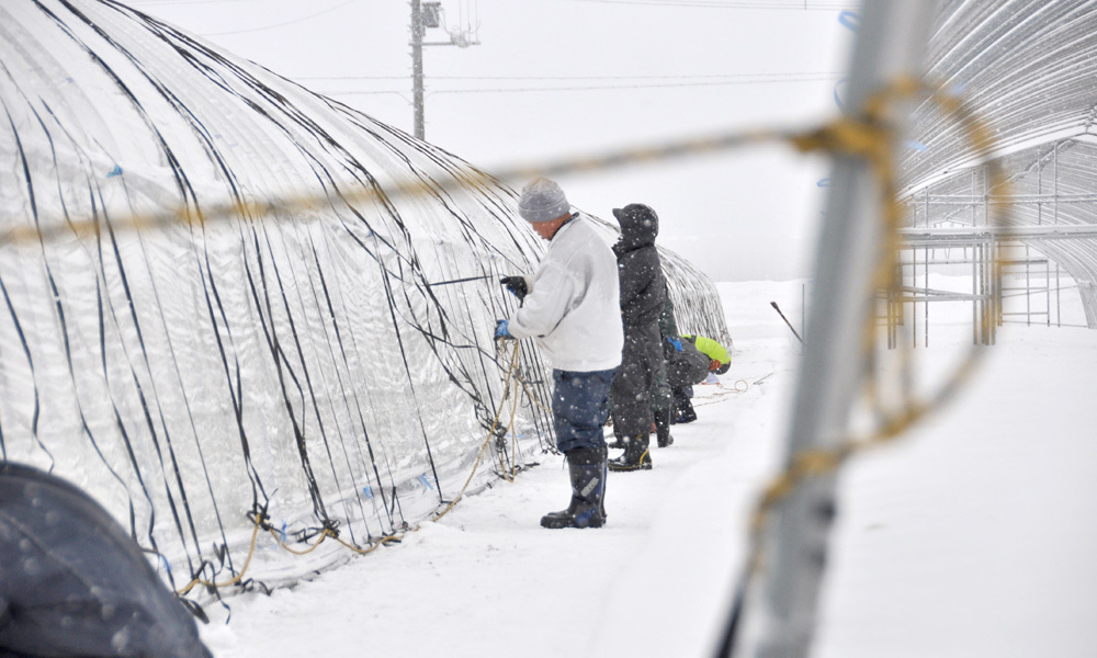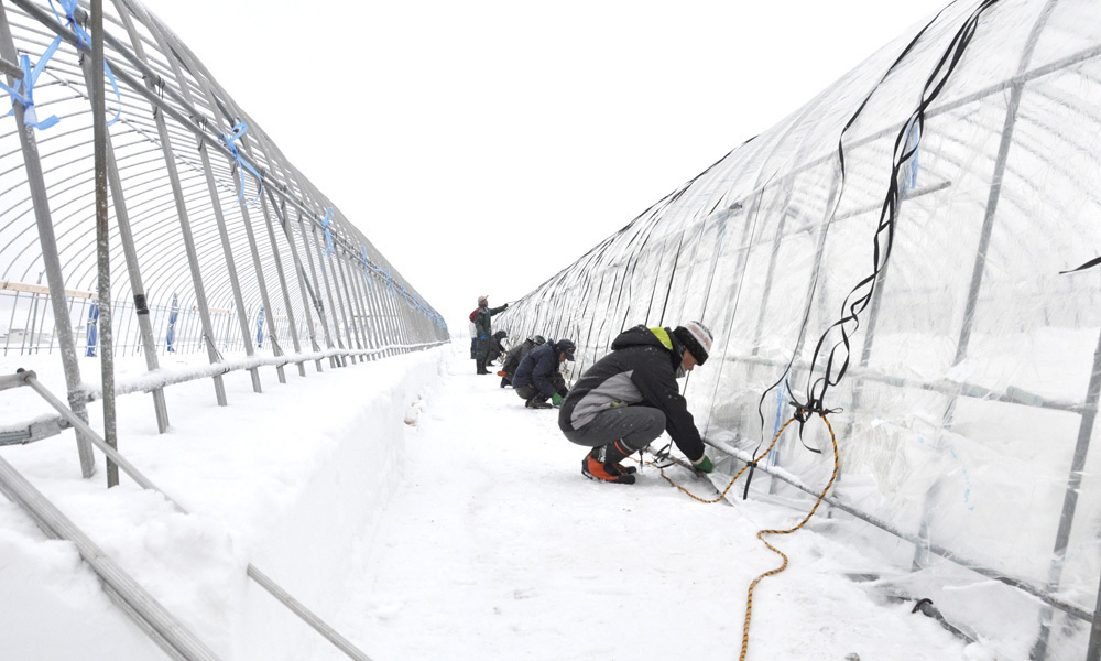 まだまだ、雪がある中で。ハウスのビニール掛け。