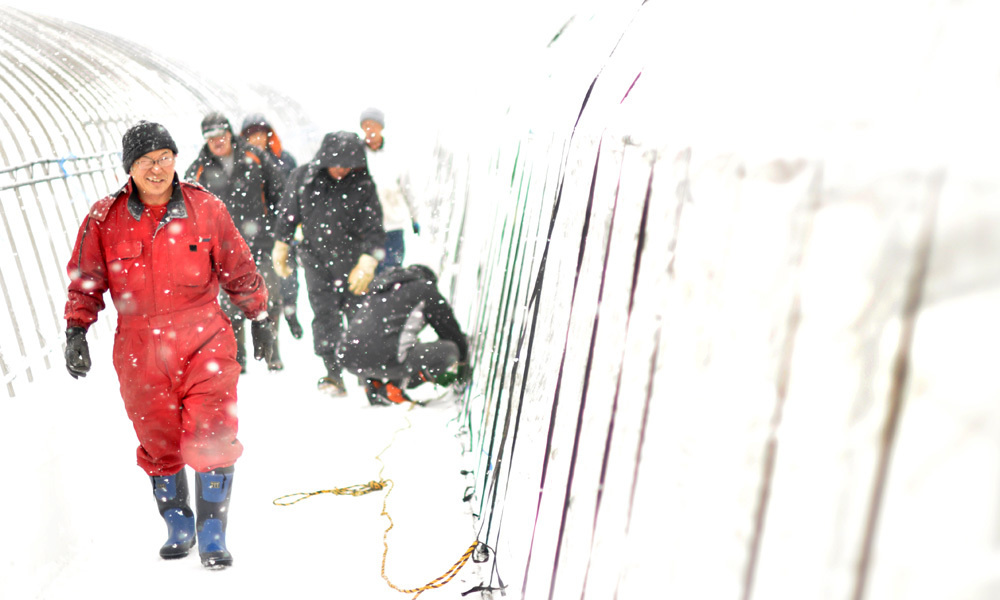 地も空も、見渡す限り真っ白な1月。もうこの作業が始まります。