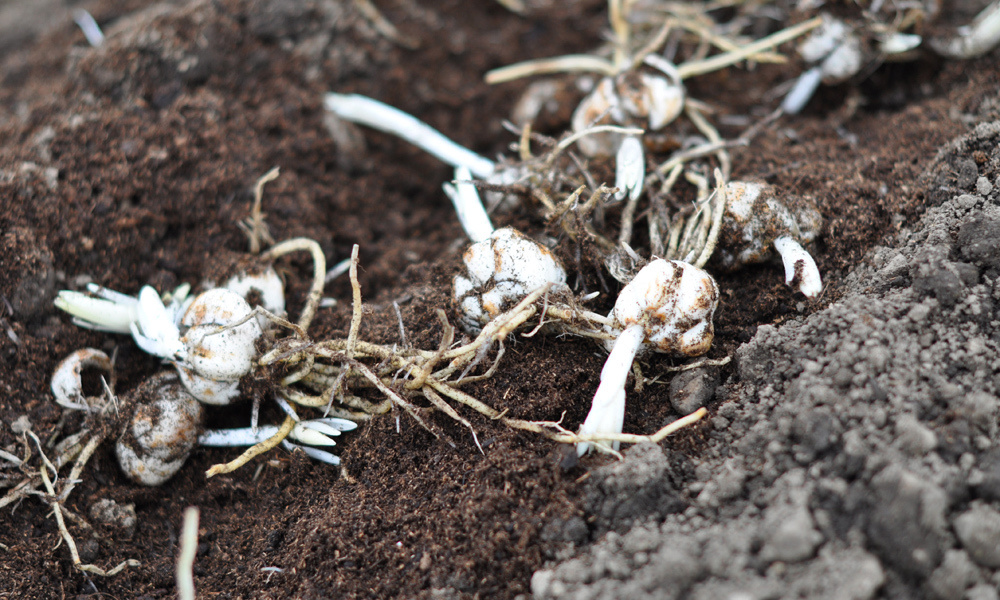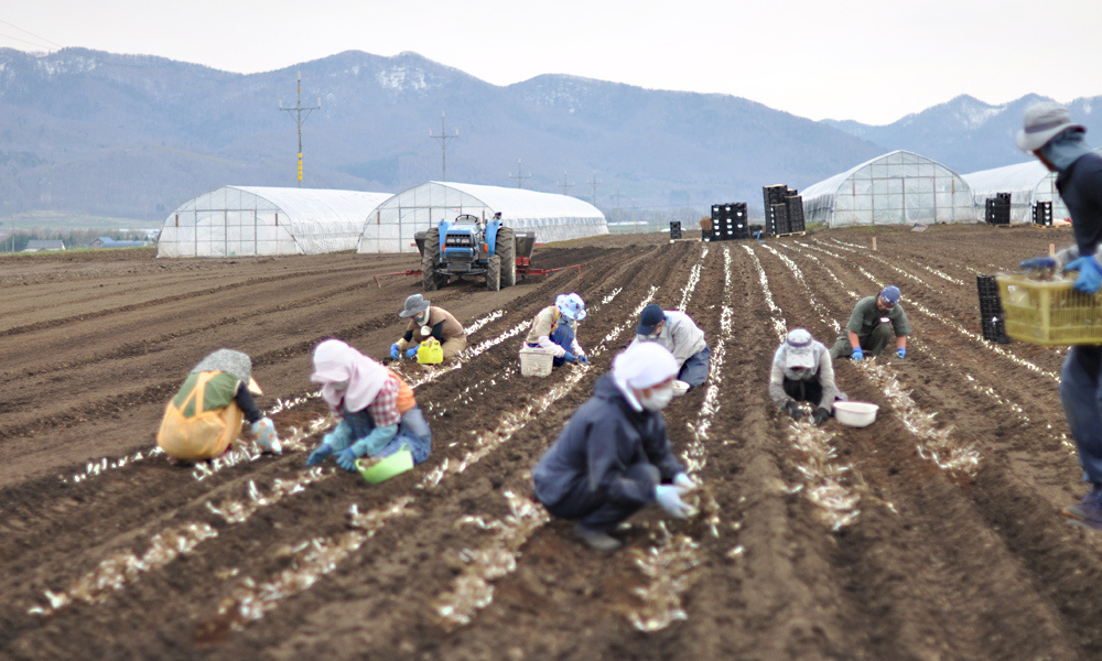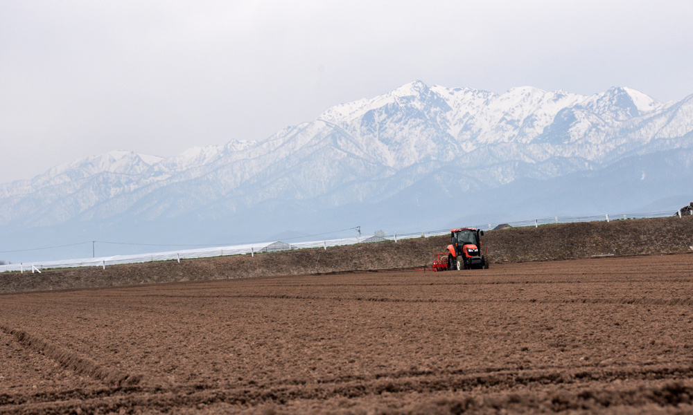 芦別岳に雪が残る中、ニンジンの種を巻きます。